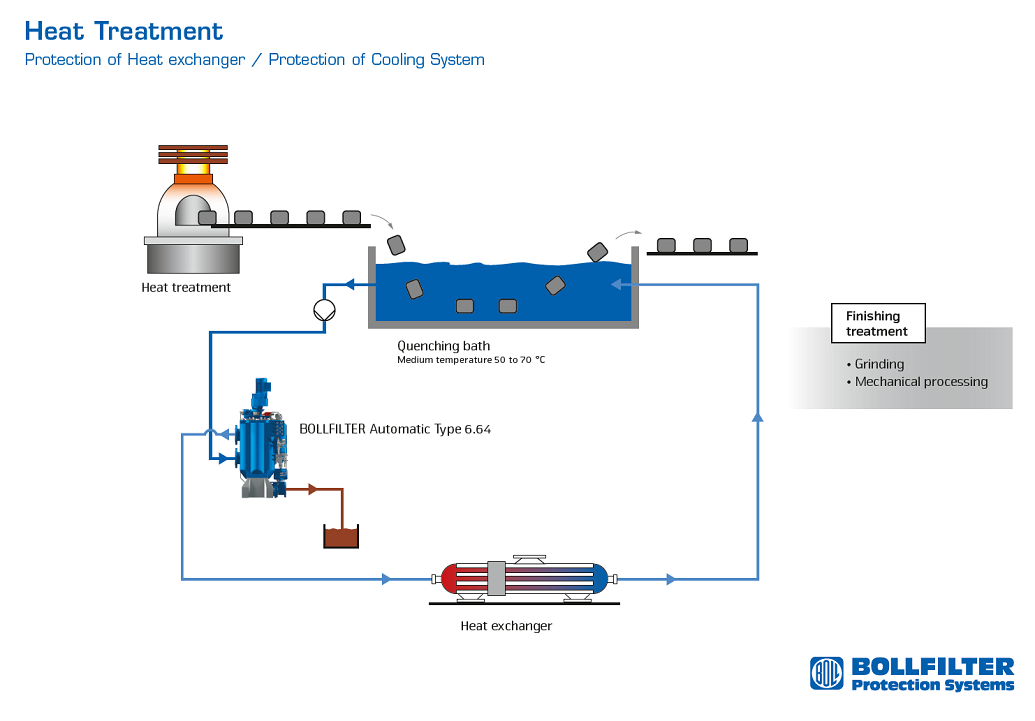 Los filtros BOLLFILTER se pueden integrar en los sistemas de temple para prolongar la vida útil de la solución de temple, además de cumplir con los requisitos de filtración y contribuir a minimizar los costes acumulables.