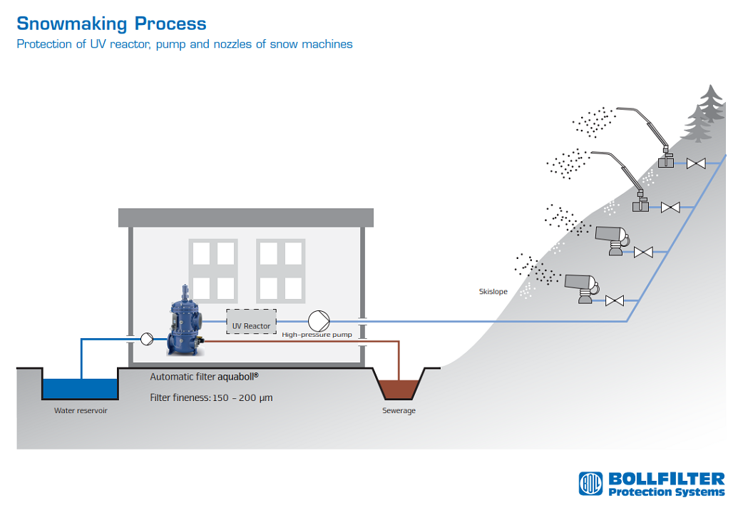 Para a produção de neve, é bombeada água a partir de lagos, riachos, lagoas ou reservatórios com alta pressão para as pistas de esqui. A água necessária é filtrada pelo filtro automático aquaBoll®. Desta forma, o filtro protege os canhões de neve ou lanças de neve. O filtro automático da BOLLFILTER filtra a água bombeada e remove partículas com um tamanho de até 200 µm.